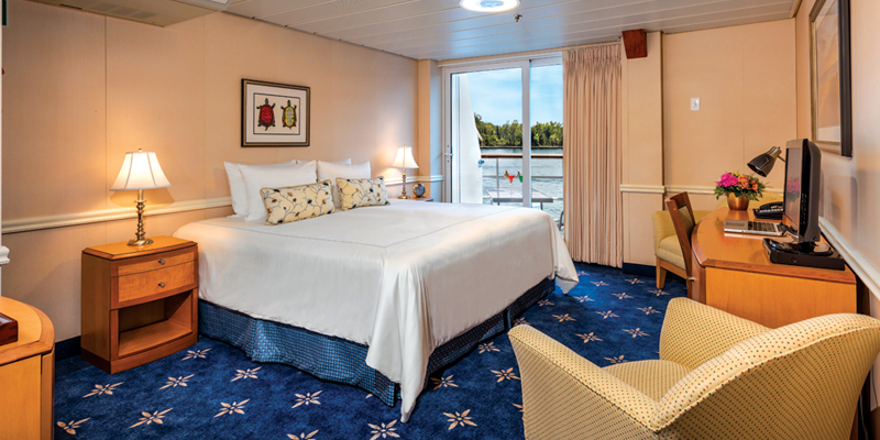 At over 450 sq. ft. the American Constellation Sky Suites are both spacious and elegantly appointed. Located on a private deck, each secluded suite offers our distinguished travelers amazing views from the private walk-out balcony. The well-furnished suites come fully equipped and offer a sitting area, writer’s desk, sliding glass door and full hotel-sized bathroom.