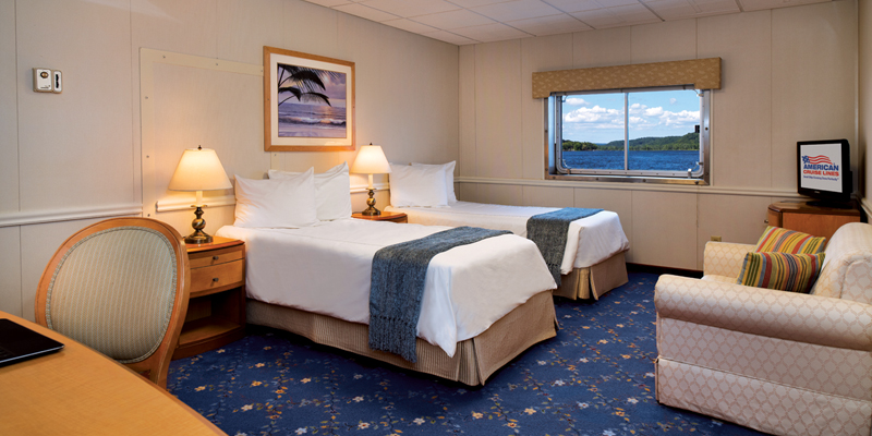 Centrally located, these 302 sq. ft. staterooms offer amazing views and easy access to the lounge areas. You’ll enjoy the expansive views out of your own large opening picture window. Each room comes equipped with a large closet and hotel-size bathrooms