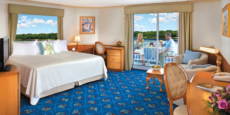 Featuring the most modern amenities, our spacious DB1 staterooms offer the perfect retreat for travelers. With over 350 sq. ft., each stateroom offers all of the comforts of a fine hotel and is configured to maximize the interior living space. These stateroom also feature full sliding glass doors and a private walk-out balcony which provides spectacular panoramic views of the surrounding scenery.
